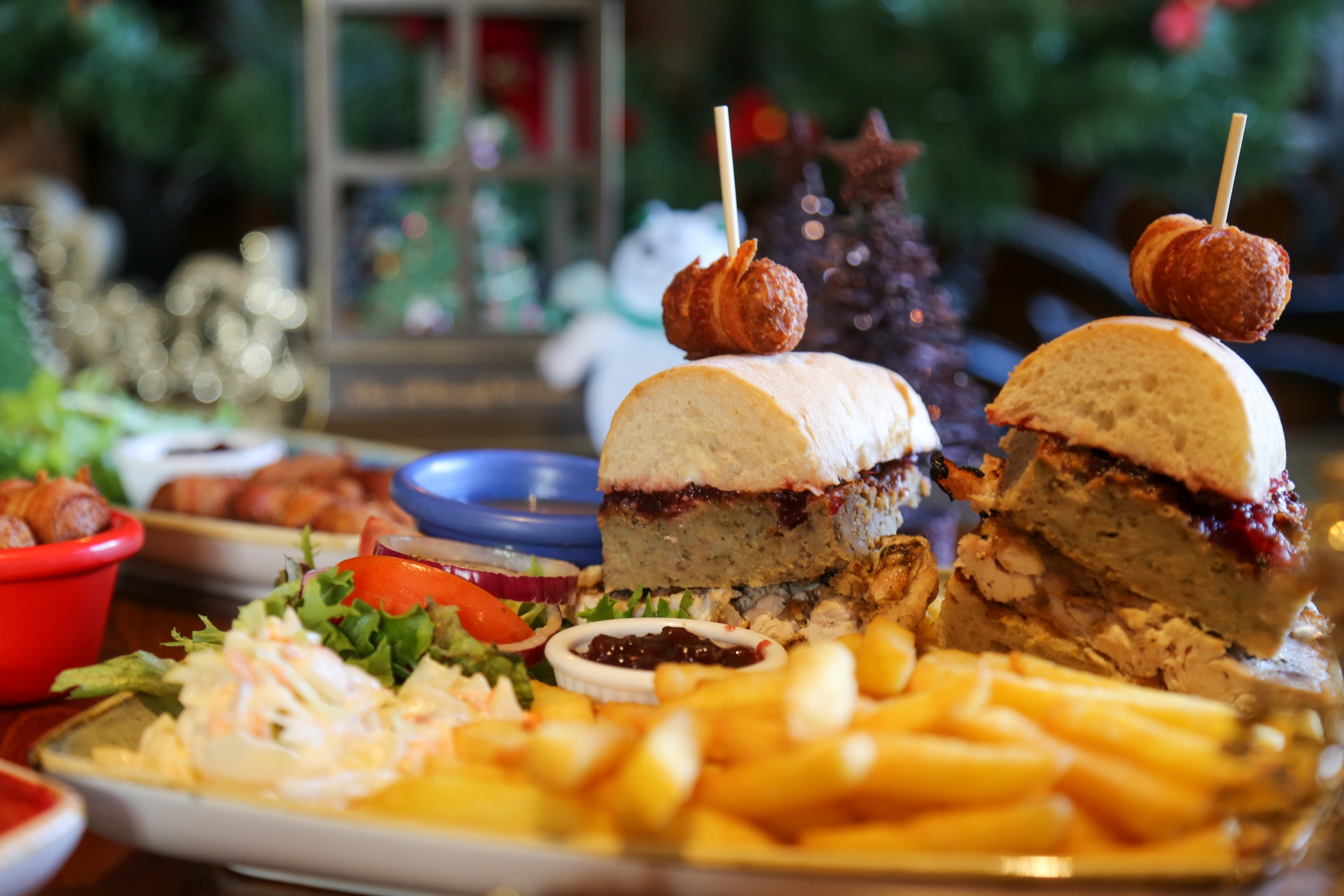 Chicken breast with sage and onion stuffing, pigs in blankets and cranberry sauce.